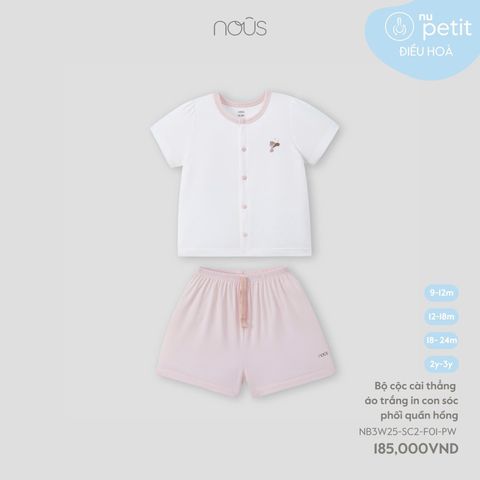 Bộ cộc cài thẳng áo trắng in con sóc phối quần hồng Nous