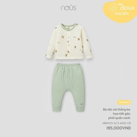 Bộ dài cài thẳng be họa tiết gấu phối quần xanh Nous