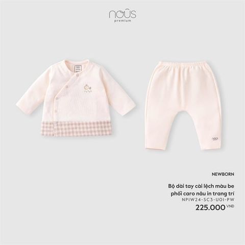 Bộ dài tay cài lệch màu be phối caro nâu in trang trí Nous