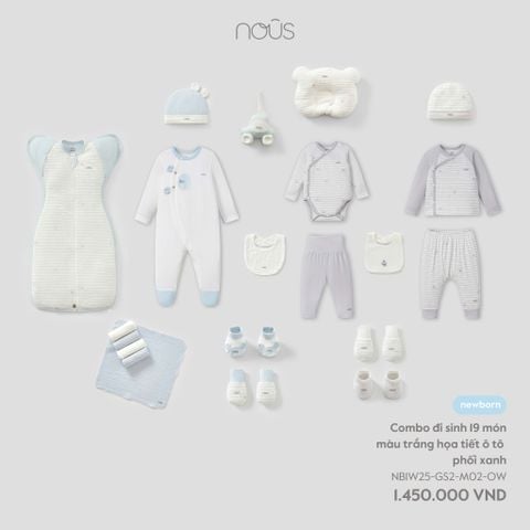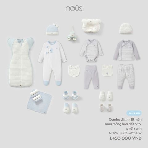 Combo đi sinh 19 món màu trắng họa tiết ô tô phối xanh Nous