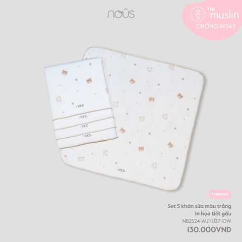 Set 5 khăn sữa màu trắng in họa tiết gấu Nous